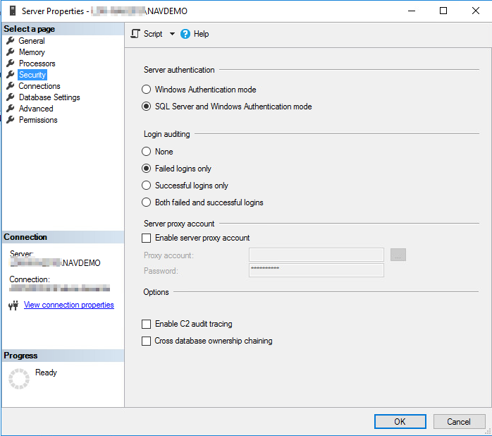 Am SQL-Server müssen einige Einstellungen verifiziert bzw. anpasst werden. Diese Einstellungen können über das Microsoft SQL Management Studio bzw. das Microsoft SQL Management Studio Express verändert werden. Die Server-Einstellungen erreicht man durch Auswahl des Datenbank-Systems im Object Explorer und Auswahl des Befehls Properties im Kontextmenü.