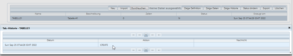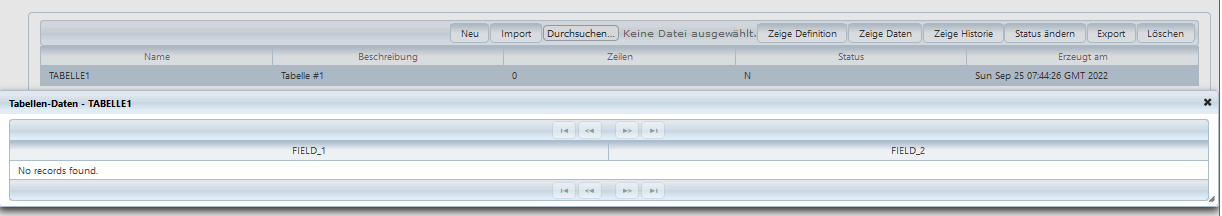 Löschen löscht die selektierte Tabelle. Es wird zuvor nach einer Bestätigung gefragt. Wurde mit Ja bestätigt, aktualisiert sich die Anzeige nach erfolgreichem Löschen automatisch selbst und die Tabelle ist nicht mehr da.