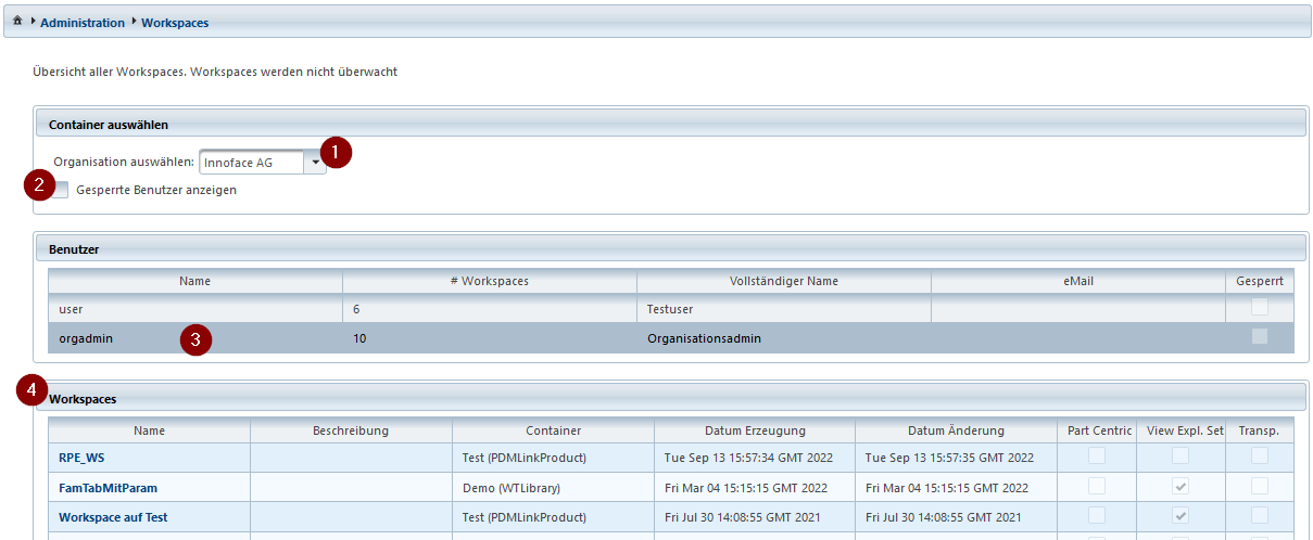 - Die aktuell verfügbaren Workspaces des Benutzers werden angezeigt. Mit einem Klick auf den Namen eines Workspaces kann man dorthin abspringen.