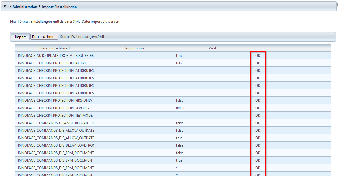 Die Spalte ganz rechts zeigt pro Einstellung, ob der Import funktioniert hat. Der Import wird durch einzelne fehlerhafte Einstellungen nicht unterbrochen.
