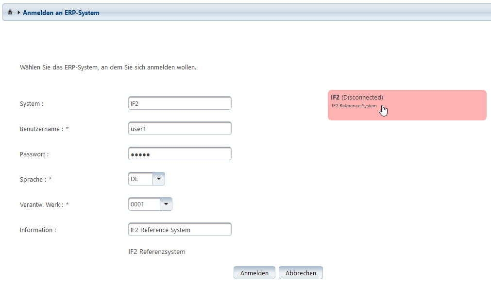 Auf dieser Seite ist die Anmeldung an ein angebundenes ERP-System via IFConneX Schnittstelle möglich.