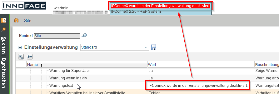 Das Verhalten von IFConneX Workflows bei deaktivierter Schnittstelle wird mit folgender Einstellung in der Kategorie INNOFACE → IFConneX → Haupteinstellungen festgelegt: