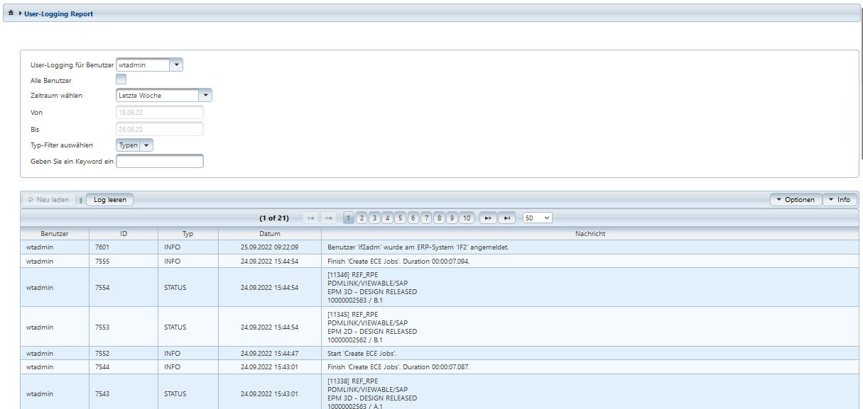Der Windchill-Benutzer hat auch die Möglichkeit, seinen eigenen Report mit Log leeren aufzuräumen.