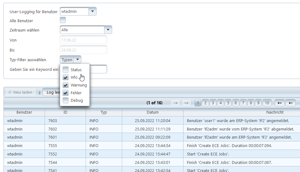 Heute:Standard-Auswahl. Schränkt die Ausgabe auf den aktuellen Tag ein.Letzte Woche:Ausgabe der letzten sieben Tage.Alle:Keine zeitliche Einschränkung.Benutzerangabe:Zeitraum kann durch eigene Angaben in den Feldern Von und Bis festgelegt werden.