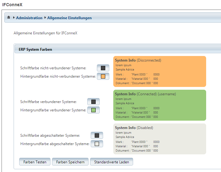 Hier können die Farben für den Status bzgl. der Anmeldung zum ERP-System vergeben werden. Es können folgende Status definiert werden: