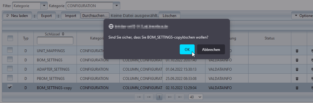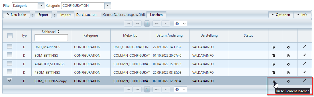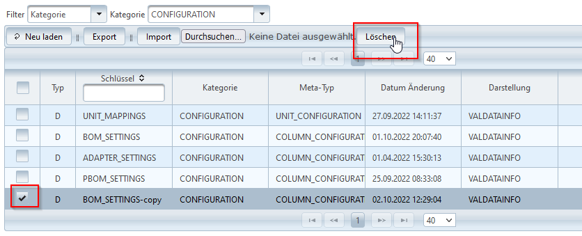 Der Löschen Button oben in der Tabelle löscht alle derzeit selektierten Einträge.
