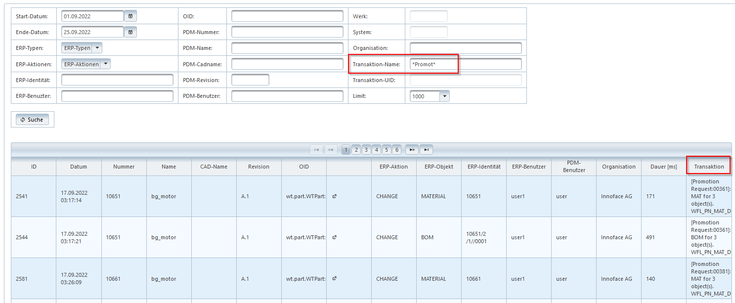 Die Spalte Transaktion enthält die Information, über welches Kommando eine IFConneX-Aktion angetriggert wurde. Im Fall von Workflows ist hier zusätzlich das PBO (Primary Business Object) hinterlegt.