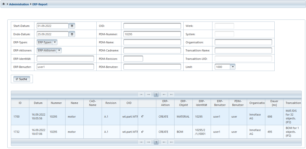 Im diesem Beispiel wurde nach den ERP-Typen "MATERIAL" und "BOM" für das Windchill Objekt mit der Nummer 10295 durch den ERP Benutzernamen "user1" gesucht.