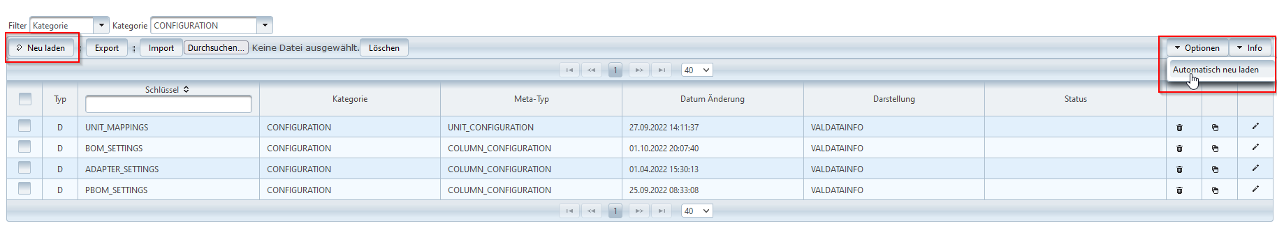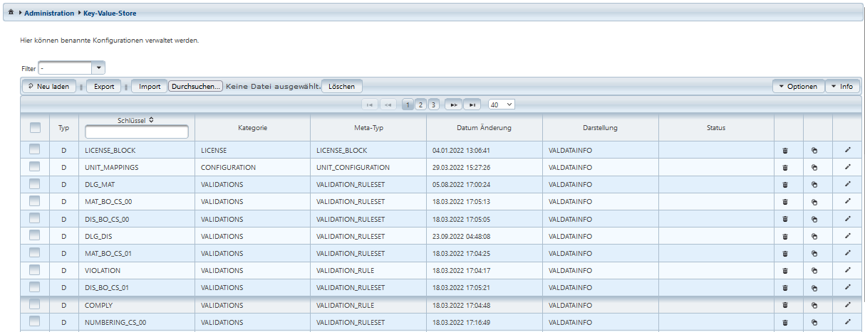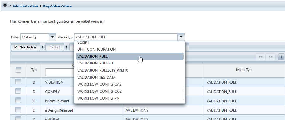Die Spalte Meta-Typ gibt einen logischen Namen bezüglich der Daten an. Ähnlich der Kategorie lassen sich Objekte somit kausal ordnen, bspw. Regeln zu VALIDATION_RULE und Regelsätze zu VALIDATION_RULESET.