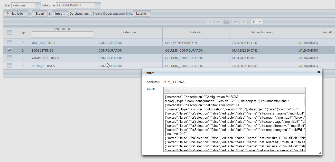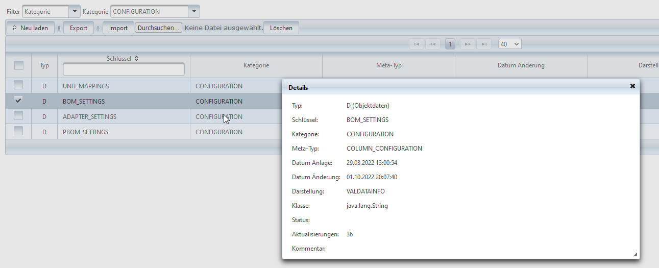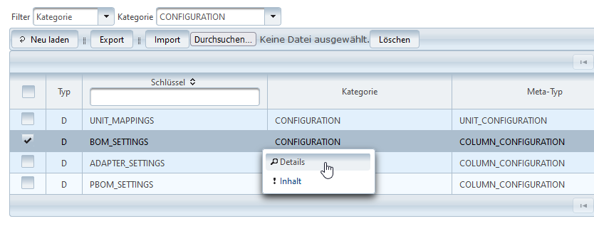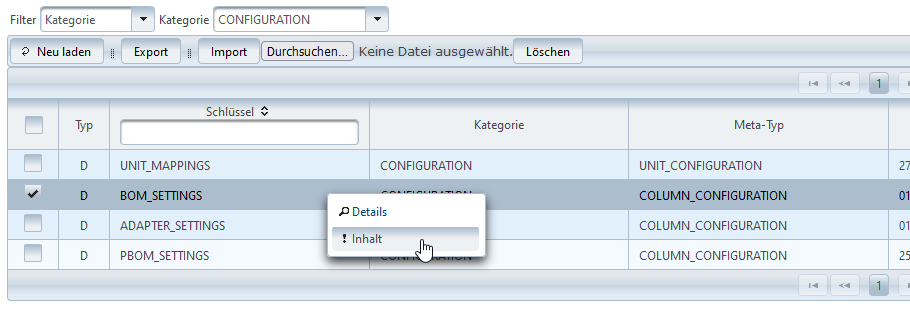 Die Spalte Schlüssel zeigt den eindeutigen Namen des Objekts. Unter diesem Namen werden die Objekte abgelegt und referenziert.