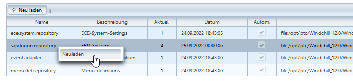 Änderungen an Dateien zur Laufzeit des Systems sind möglich. Ein Site Administrator kann die Dateien mit einem Rechtsklick auf die jeweilige Zeile in der Tabelle und anschließendem Klick auf Neuladen aktualisieren.