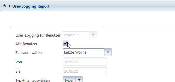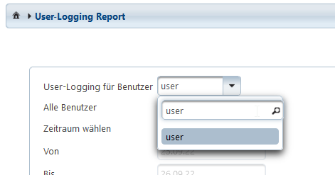Die Dropdown-Liste zu User-Logging für Benutzer ist für normale Benutzer nicht änderbar. Administratoren können hier jedoch bestimmte Benutzer auswählen, um sich deren Report anzusehen. In dieser Liste kann auch nach Benutzernamen gesucht werden, um die Selektion zu erleichtern.