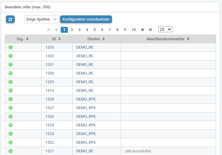 Es werden maximal die letzten 250 Jobs gelistet. Über die Seitennummerierung kann durch die Liste der Jobs geblättert werden. Die Anzahl der pro Seite gelisteten Jobs kann eingestellt werden. In der u.a. Abbildung sind dies 25 Jobs pro Seite, somit 10 darstellbare Seiten zum Blättern.