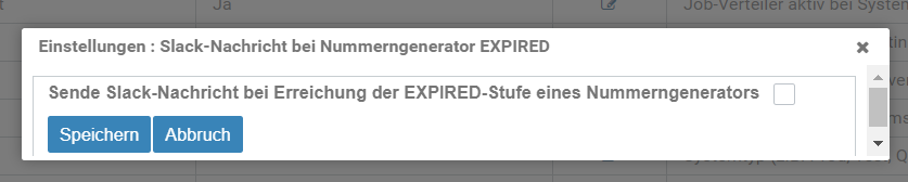 Abbildung: Editierbare Systemeinstellungen, Benachrichtigungen , Slack-Nachricht bei Nummerngenerator WARN