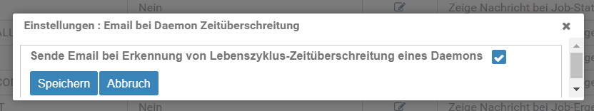 - Email bei Daemon Zeitüberschreitung: Bei "ja" wird eine Email an die Mitglieder der Gruppe @ADMINDAEMON geschickt, wenn sich ein Daemon unerwartet beendet hat.