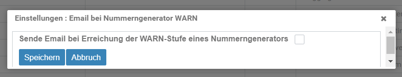 - Email bei Nummerngenerator WARN: Wenn "ja" wird eine E-Mail an die Mitglieder der Gruppe @ADMIN-NG geschickt, wenn ein Nummerngenerator die WARN-Stufe erreicht hat.