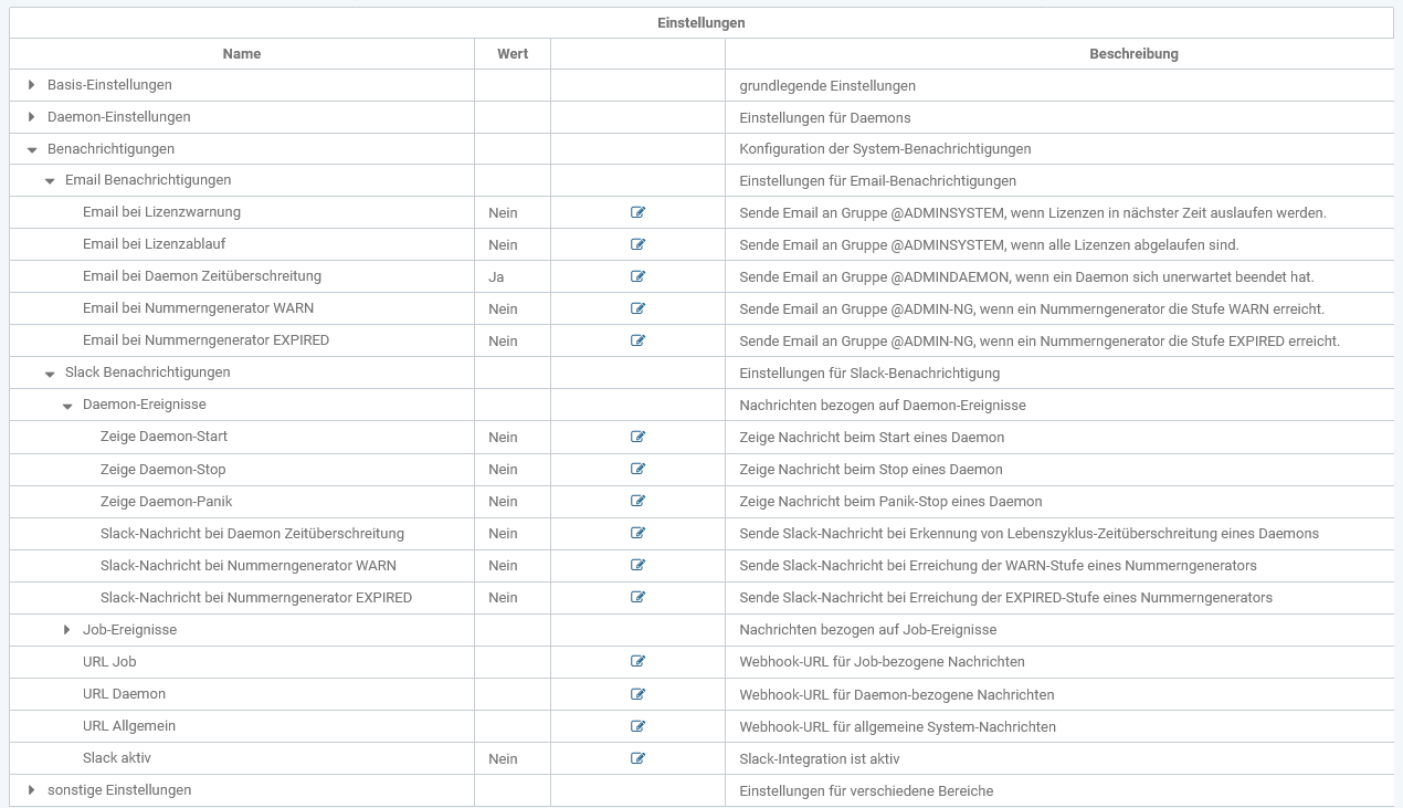 Abbildung: Editierbare Systemeinstellungen, Benachrichtigungen , Slack Benachrichtigungen, URL Daemon
