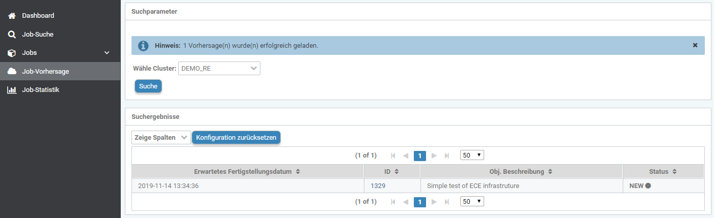 Auf Job-Vorhersage kann eine Abfrage über die voraussichtliche Abarbeitung von Jobs nach Clustern vorgenommen werden.