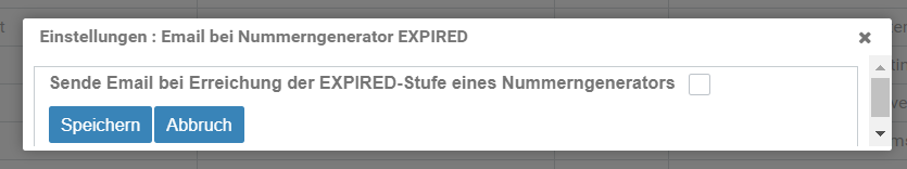 - Email bei Nummerngenerator EXPIRED: Wenn "ja"wird eine E-Mail an die Mitglieder der Gruppe @ADMIN-NG geschickt, wenn ein Nummerngenerator die EXPIRED-Stufe (letzte Nummer wurde gerade vergeben) erreicht hat.