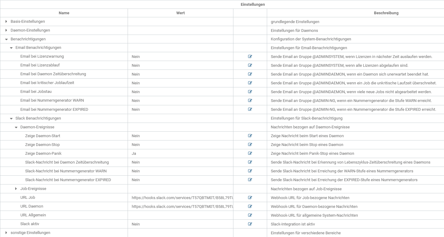 Abbildung: Editierbare Systemeinstellungen, Benachrichtigungen , Slack Benachrichtigungen, URL Daemon