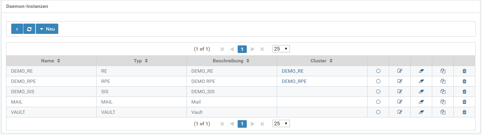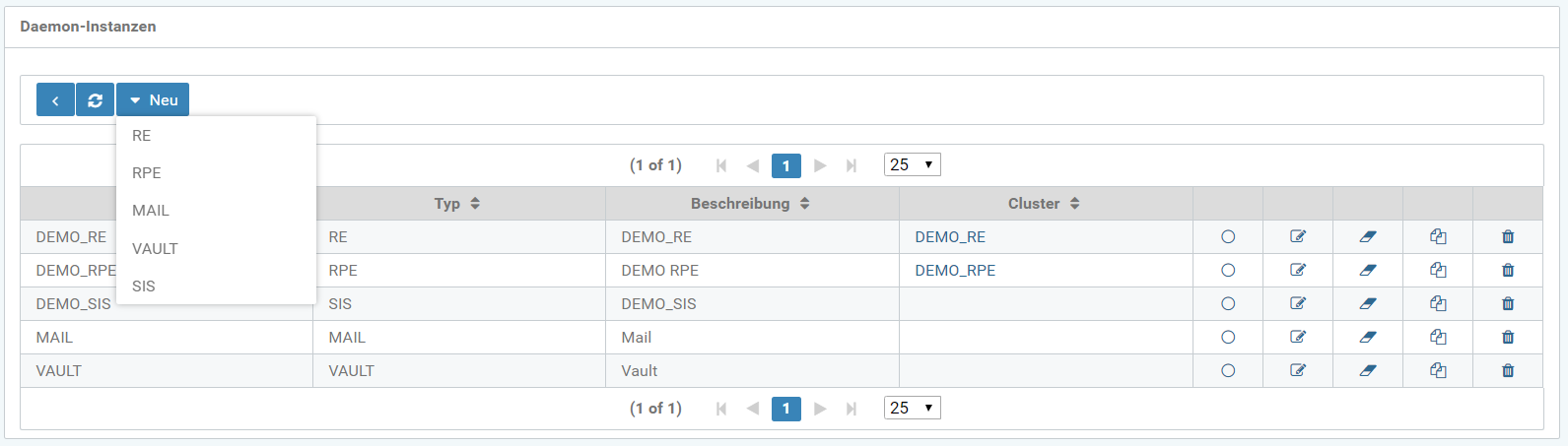 Innerhalb des Bereiches Daemon-Instanzen können verschiedene Daemons konfiguriert werden. Es gibt die Typen RE, RPE, VAULT, MAIL und SIS.