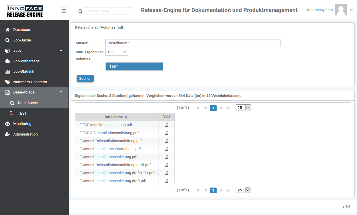 Im Eingabefeld Muster kann ein Such-Muster ohne Dateierweiterung eingegeben werden. Es werden dann alle Dateien vom oben angezeigten Typ nach diesem Muster durchsucht. Die folgende Abbildung zeigt also eine Suche nach PDF-Dateien, die das Wort "Installation" im Namen haben. Als Datenträger wurde "TEST" ausgewählt. An dieser Stelle erscheinen alle Datenträger, die in der Administration angelegt wurden und können auch geziehlt zur Suche ausgewählt werden.