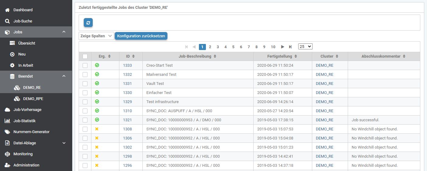 Die Tabellenansicht zeigt standardmäßig die Spalten Erg., ID, Job-Beschreibung, Fertigstellung, Cluster und Abschlusskommentar.