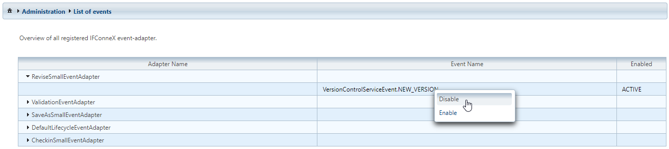 The event monitor displays all event adapters which are registered in IFConneX as well as the events they "listen" to.