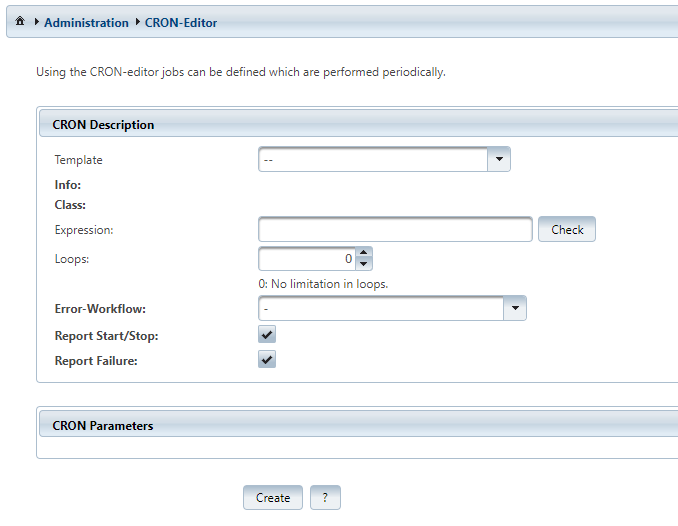 Loops | The number of executions can be limited in this field. This information is optional. For a test-run, e.g. "1" can be inserted here while the expression "* * * * *" is specified. |