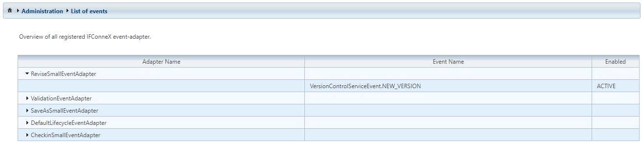 The event monitor displays all event adapters which are registered in IFConneX as well as the events they "listen" to.