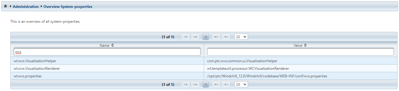 Displays all wt.properties which are set in the current Windchill system. Filtering by Name or Value is possible.