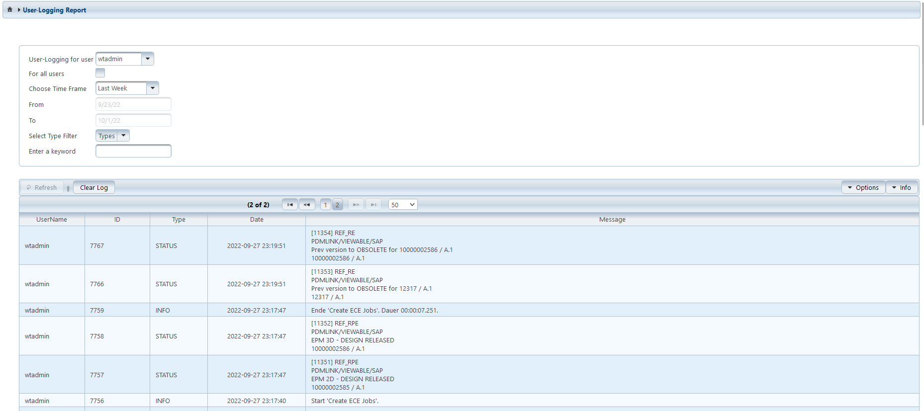 The Windchill user may clean up his or her own report by choosing Clear Log.