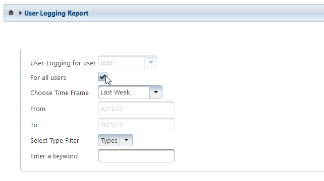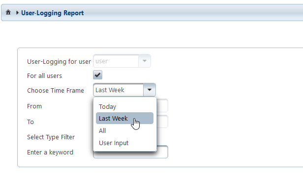 The dropdown list of User-Logging for user can not be changed by common users. Administrators, however, can select certain users in order to look at their reports. To facilitate the selection, it is possible to search for user names in this list.