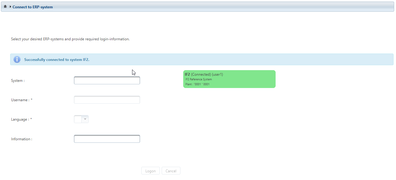 On this page, the login to a connected ERP system via the IFConneX interface is possible.