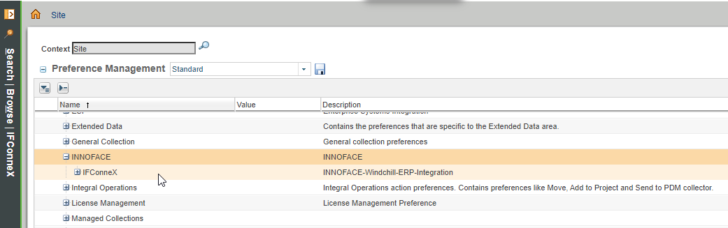 The preference management of Windchill contains IFConneX settings which can be administered and customized by a site administrator.