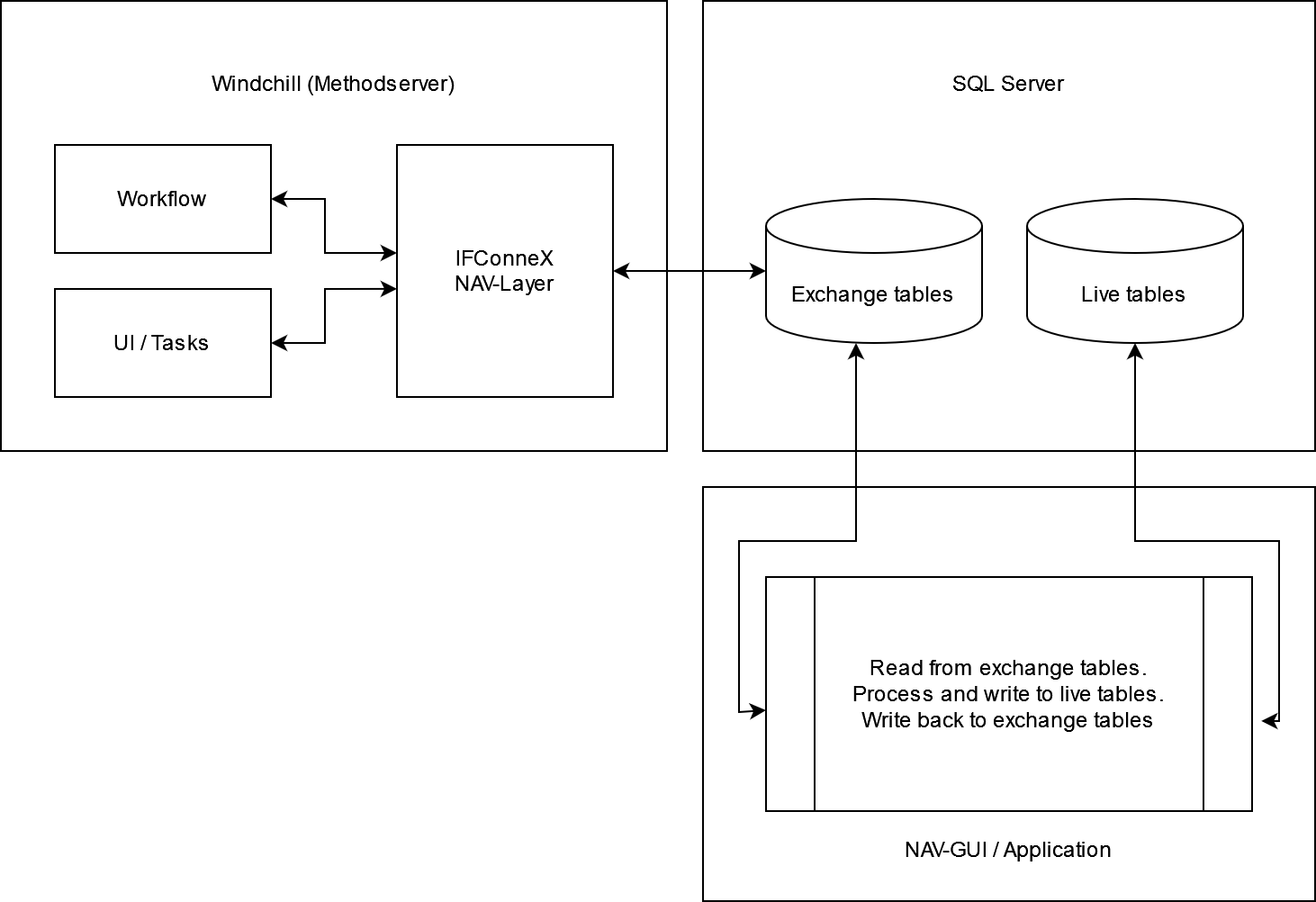 The IFConneX NAV layer generalizes the communication for Windchill with the Navision system. Depending on the specification of the IFConneX interface, the NAV layer is called either via the standard interface commands or via project specific workflow robots.