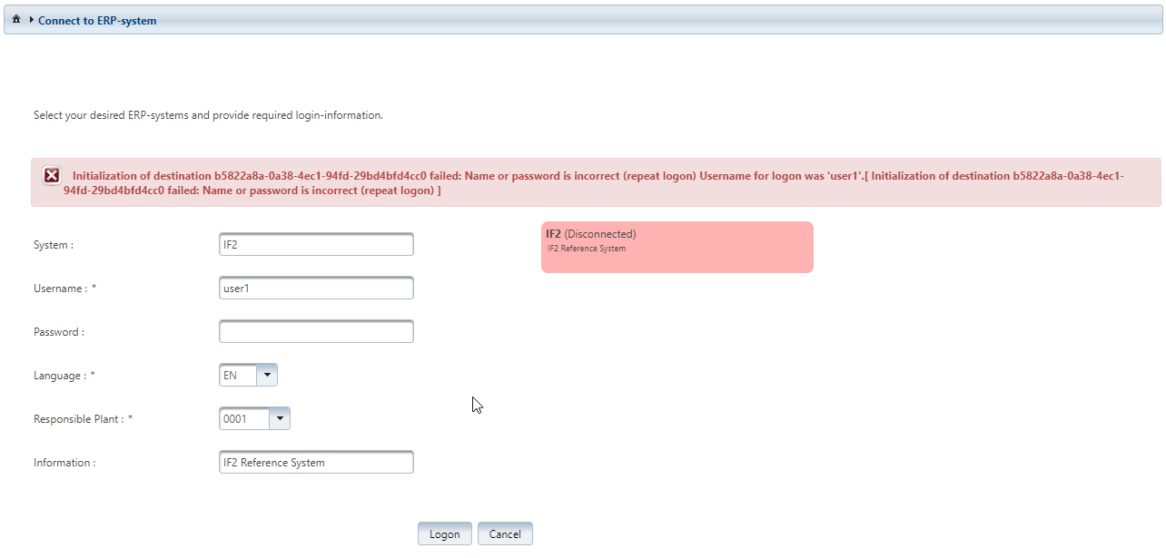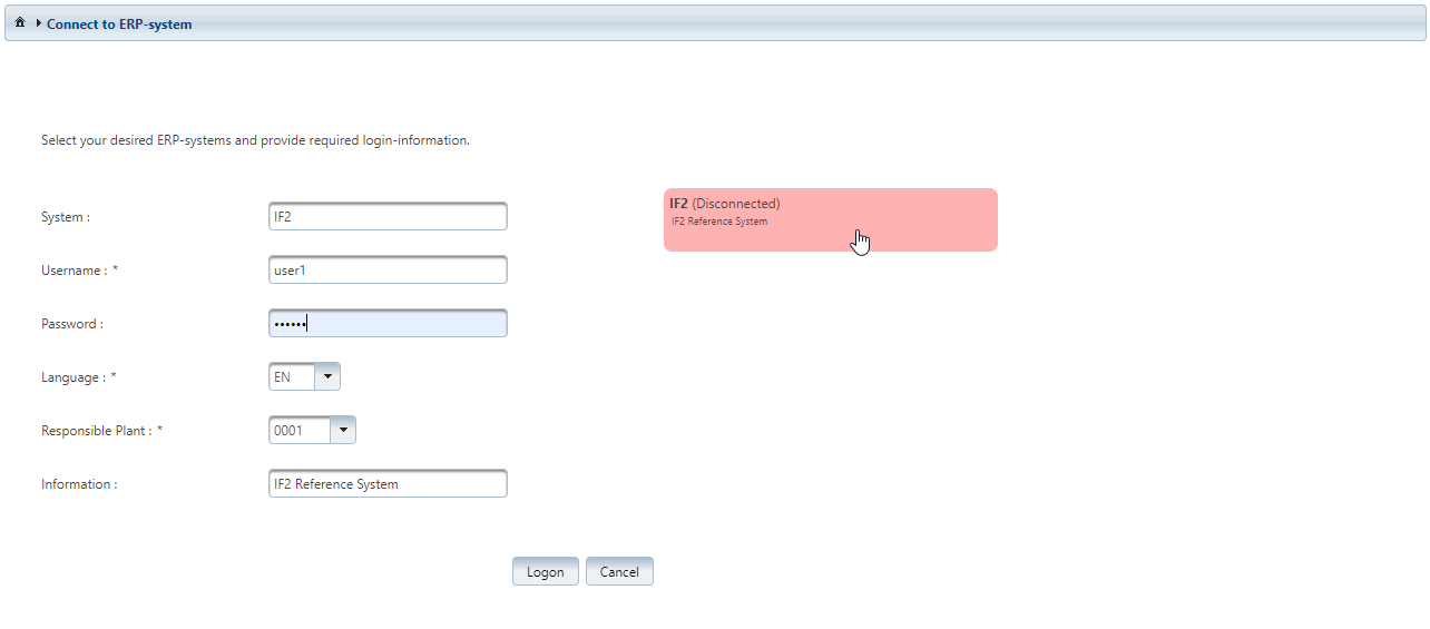 On this page, the login to a connected ERP system via the IFConneX interface is possible.