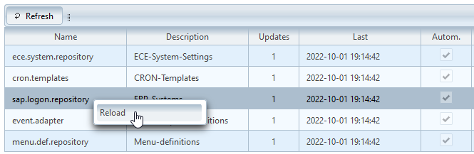 Changes to files during the runtime of the system are possible. A site administrator can refresh the files with a right click on the corresponding line and a further click on Reload.