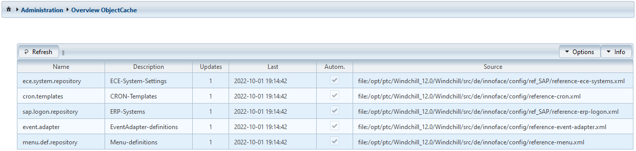 The ObjectCache is administered by the DataServer. It contains complex configurations which are available in the entire Windchill system. In the generated overview, it is evident, which object of the cache has been refreshed at what time.