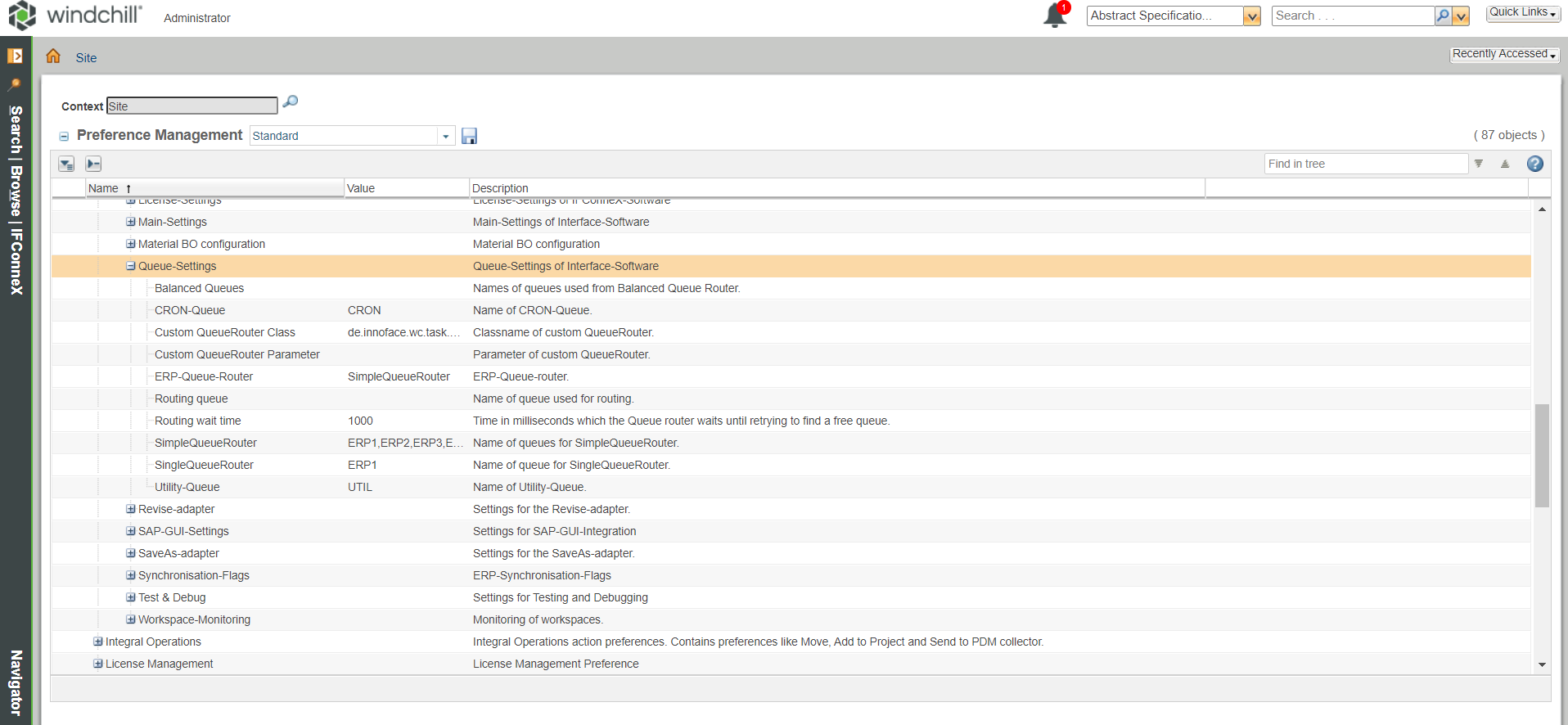 The registration of the queues must be performed by a Windchill site administrator. The previously created queues have to be stored in the Windchill settings. Browse → Site → Utilities → Preference Management