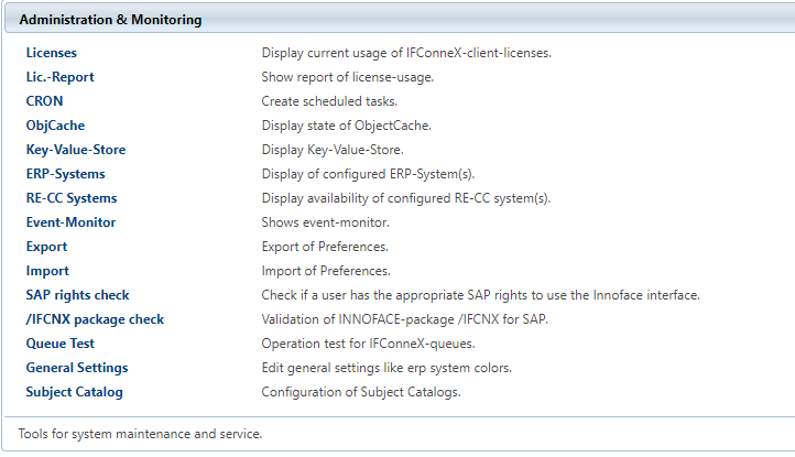 The items of the IFConneX → Administration can be found in the section 'Administration & Monitoring'.