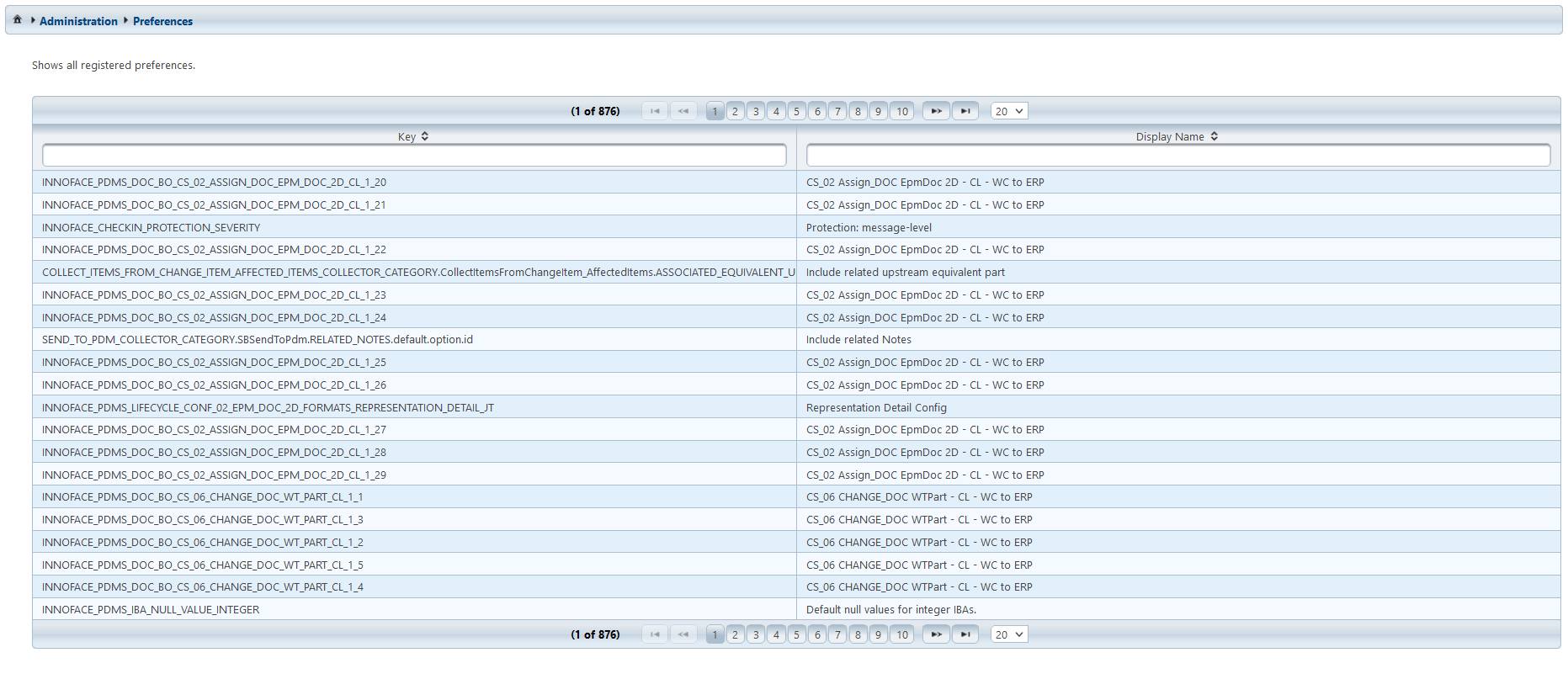 The table shows all settings which are registered in Windchill, including the hidden settings.