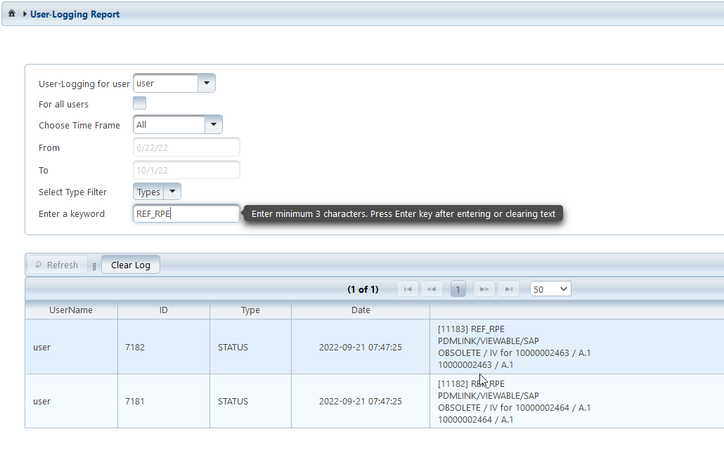 The Windchill user may clean up his or her own report by choosing Clear Log.
