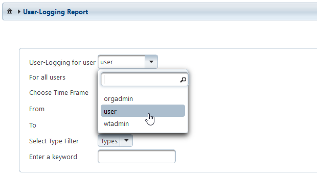 The dropdown list of User-Logging for user can not be changed by common users. Administrators, however, can select certain users in order to look at their reports. To facilitate the selection, it is possible to search for user names in this list.