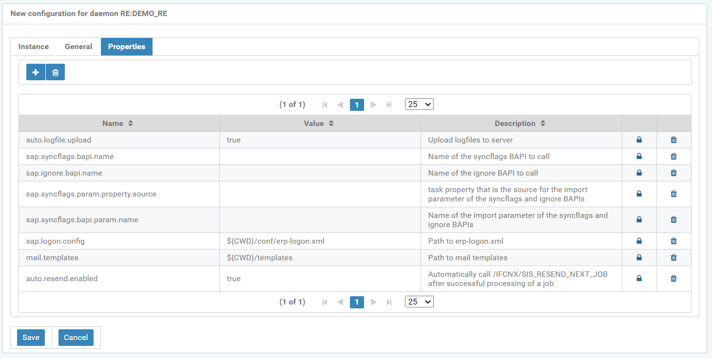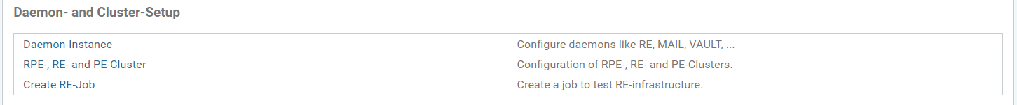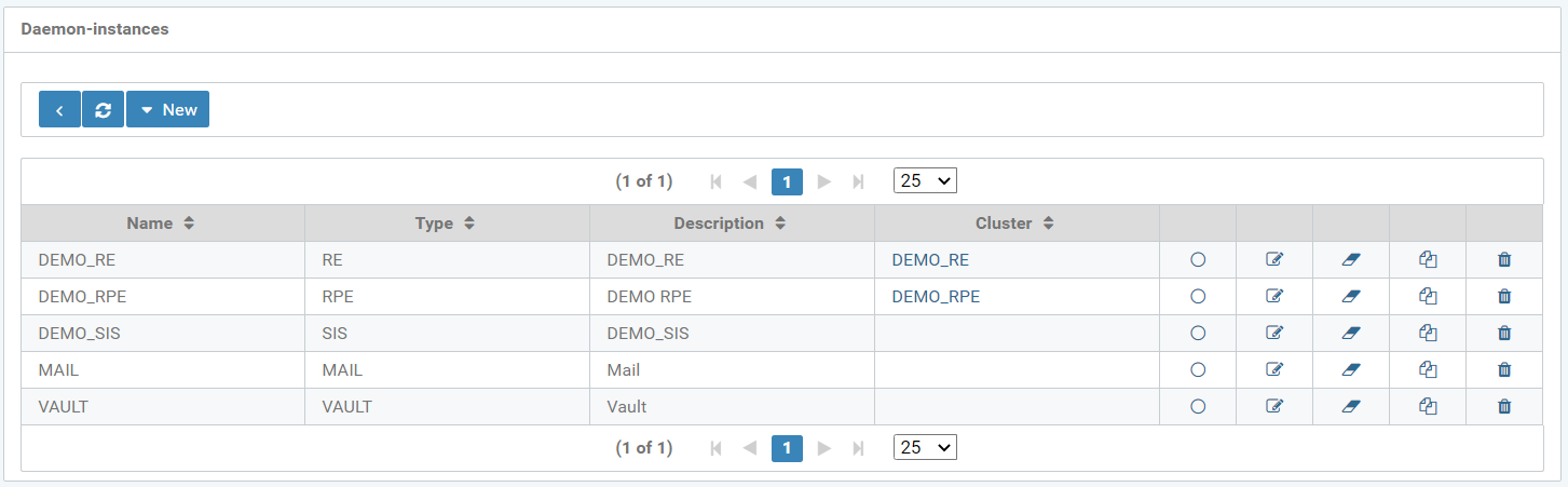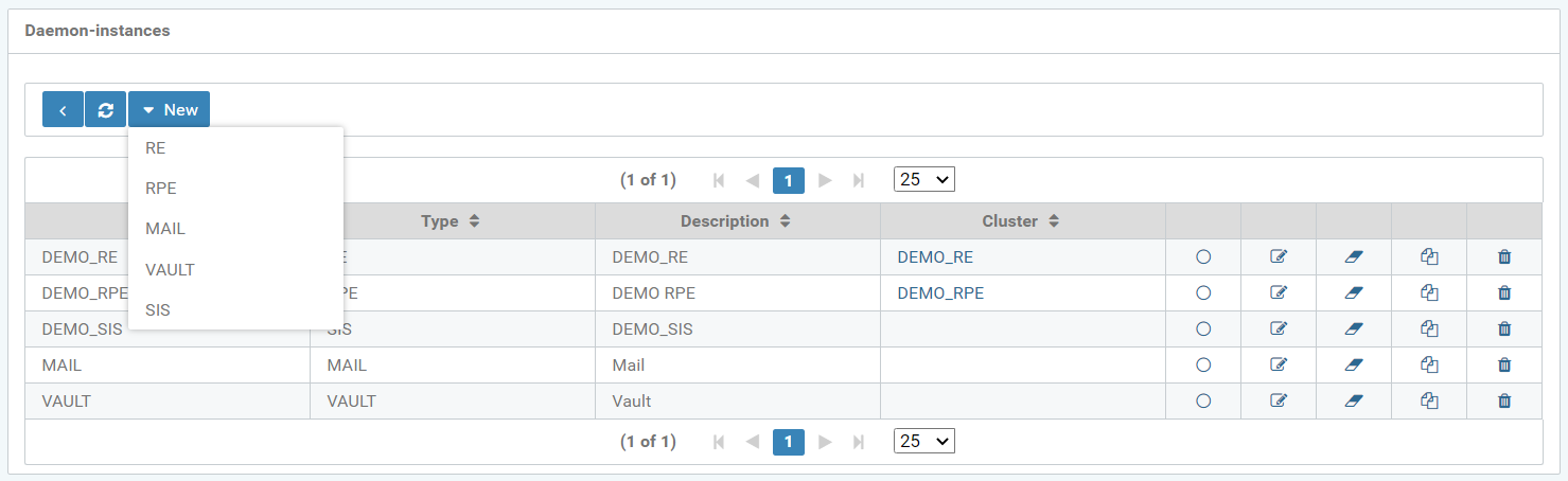 The Daemon instances area facilitates the configuration of various daemons. Possible types are RE, RPE, VAULT, MAIL and SIS.