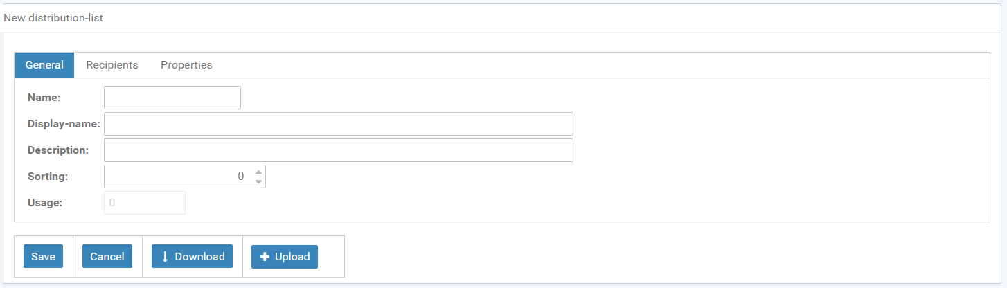 Create new distribution lists with the "+" icon. When selecting this, a new "Create distribution list" window opens.