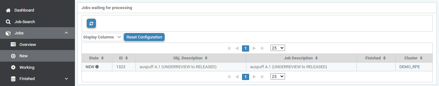 The table can be reloaded with the reload button.The table view displays by default the columns Status, ID, Obj. Description, Job Description, Finished and Cluster.