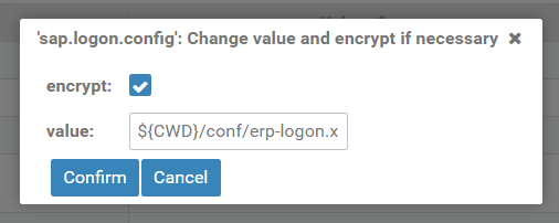 A daemon property can be encrypted by clicking on the encrypt icon (lock icon), which opens the window, see figure below. It can be activated by checking the "encrypt" box. The property can also be viewed and modified in plain text and decrypted again if required. With "Confirm" this input is confirmed.