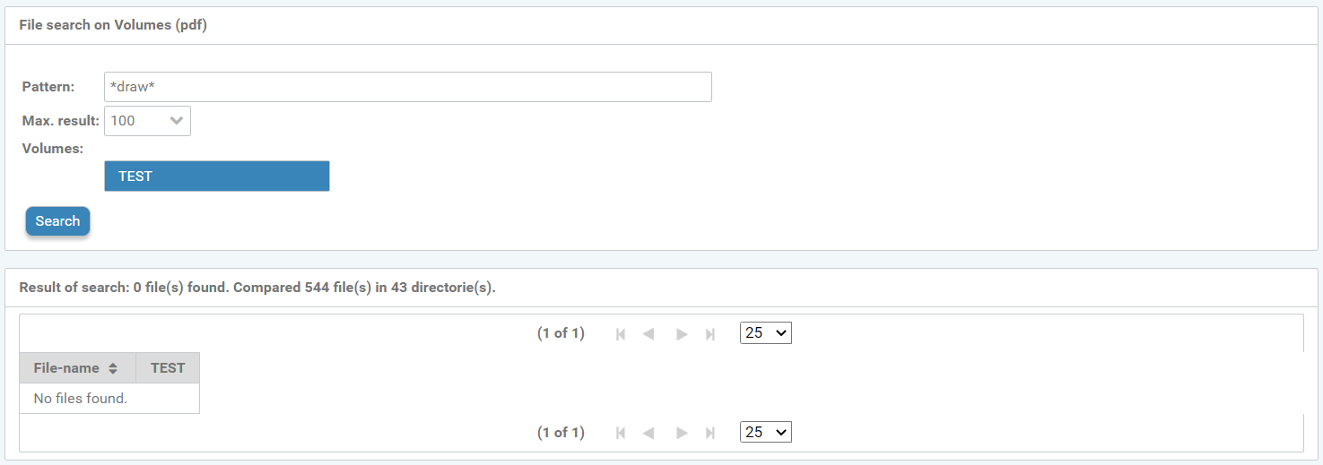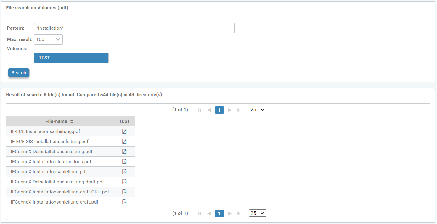 In the Pattern input field, you can enter a search pattern without a file extension. This initiates a search for all files of the type shown above with the particular pattern. The following figure shows a search for PDF files that have the word "installation" in their name. We selected “TEST" as the disk. At this point, all data carriers/disks that have been created in Administration appear and can be selected for search.