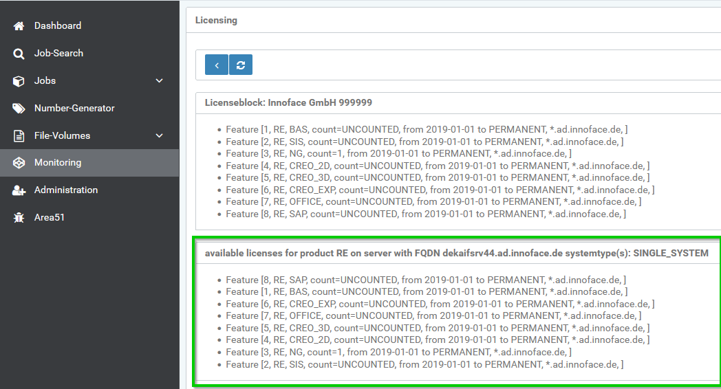 Via Monitoring → Licensing, the import of the new license can be verified. All required features should be listed.